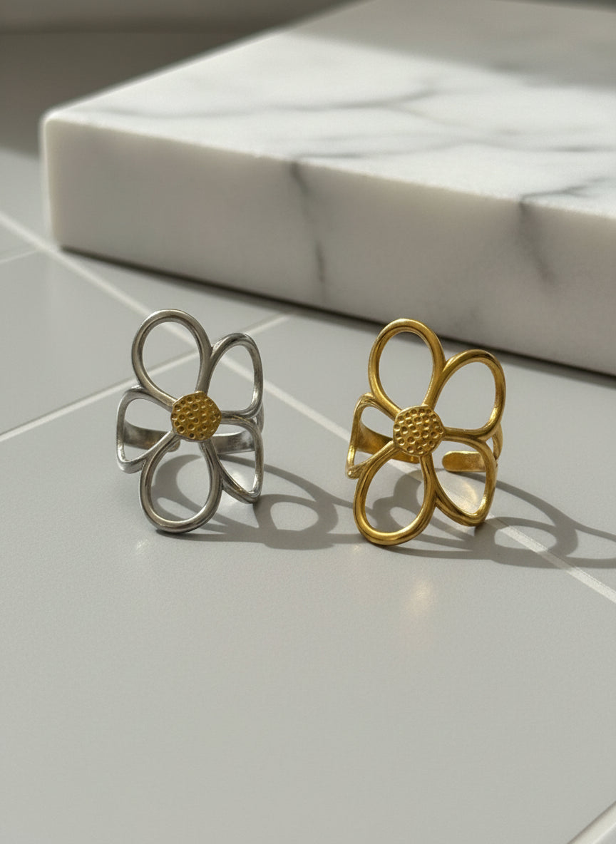 Fall in love with our daisy ring, available in gold and two tone gold with silver stainless steel. This delicate and charming ring adds a touch of elegance and playfulness to any outfit. Perfect for everyday wear or special occasions, it's a must-have for any jewelry lover.
